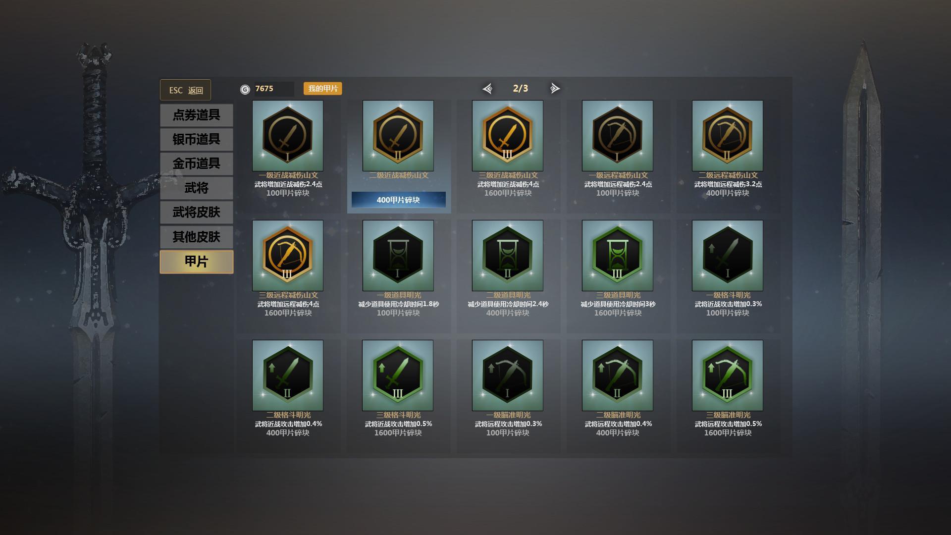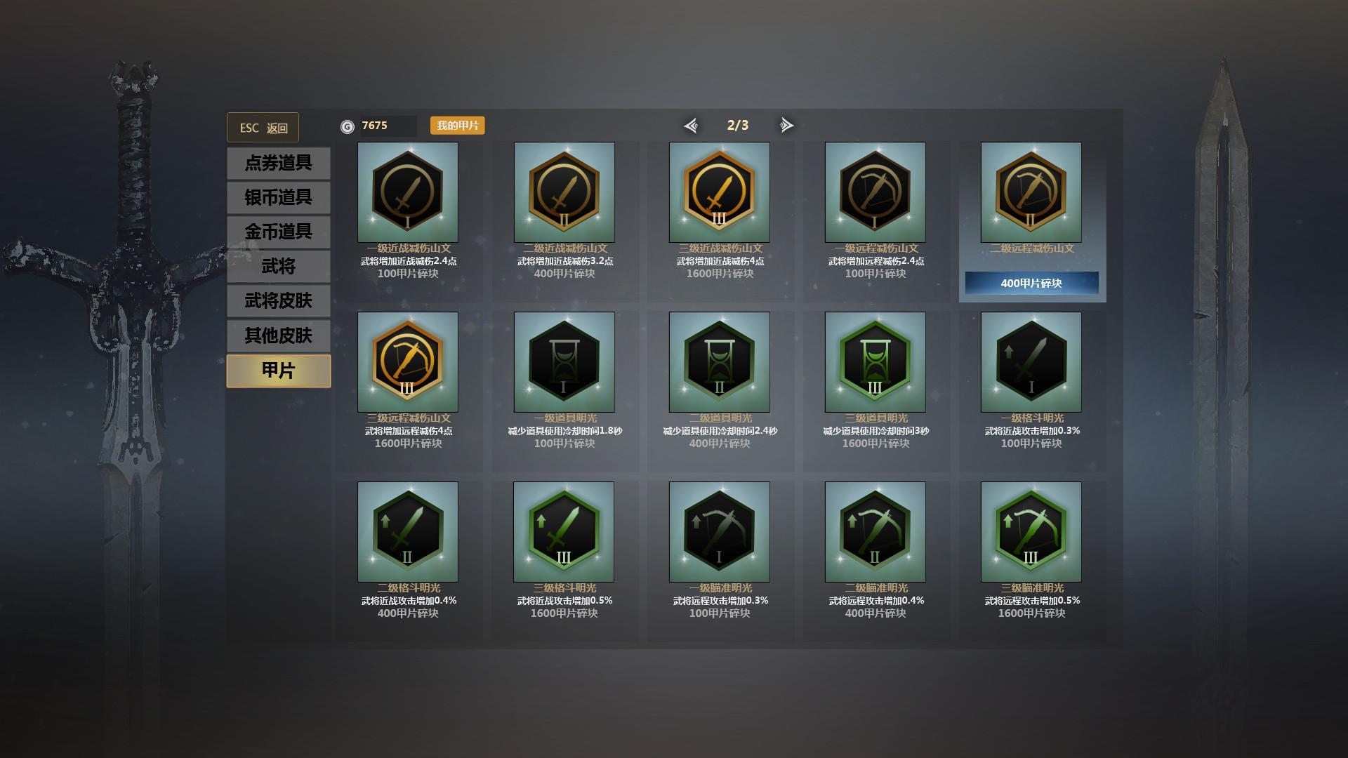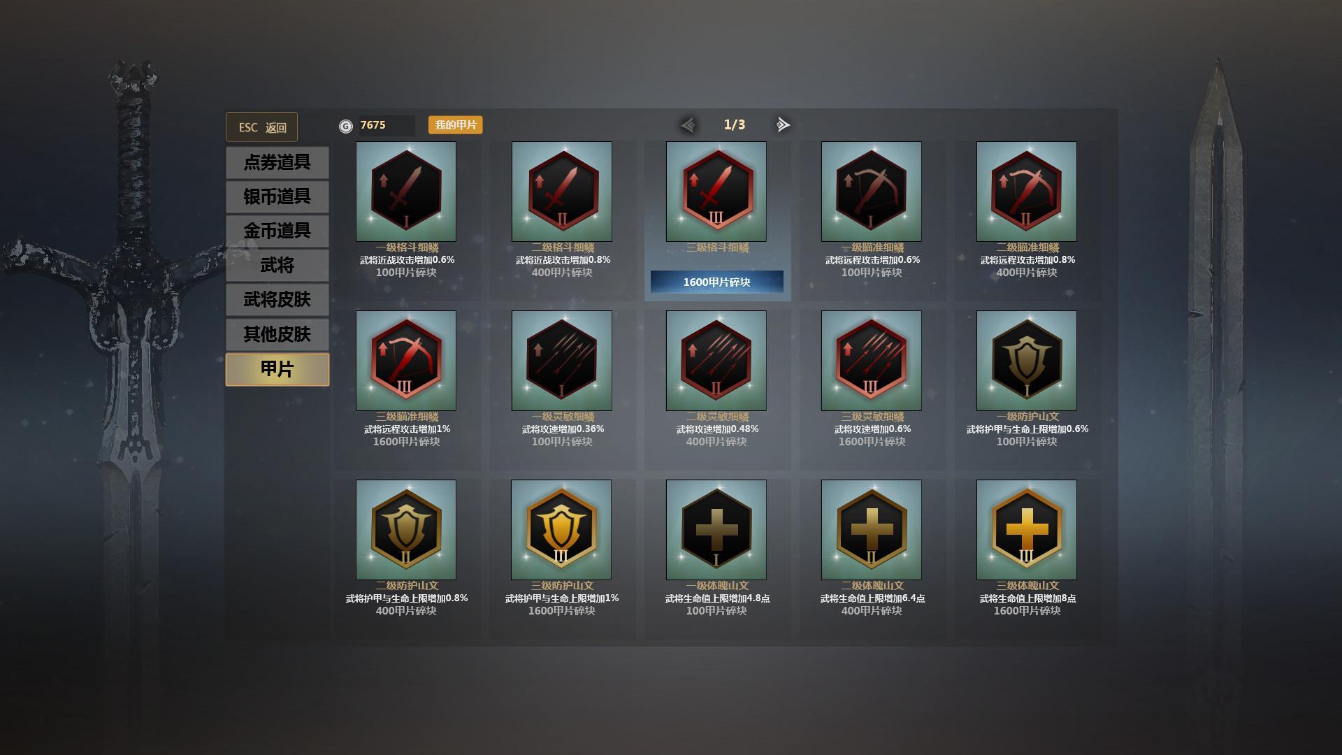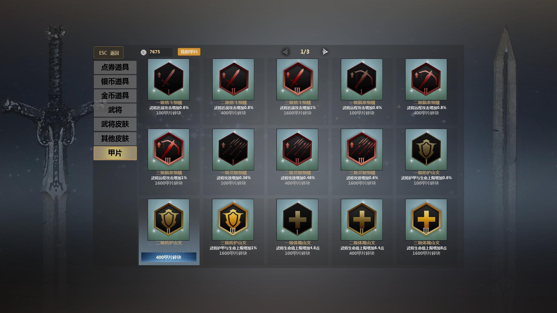 英雄对决没有部队参与,那么这个甲片系统就很关键,甲片有攻击加成、攻速加成、HP加成、减伤、道具冷却、针对不同的英雄就该搭配合理的甲片。如伊贺战忍的服部半藏、十字军对攻速的需求、关羽、杰拉德等骑兵则对攻击力的需求、凌统、貂蝉对减伤等等。