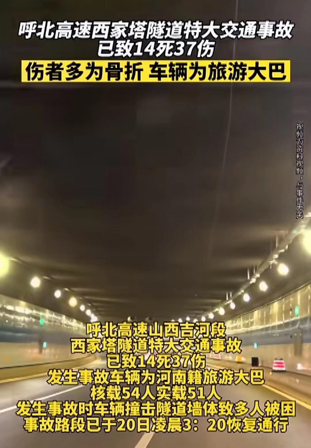 3月19日下午,呼北高速山西吉河段,一辆载着51名旅客的大巴车突然失控,在隧道内撞击隧道壁。巨大的冲击力仿佛要将整个隧道撕裂,事故导致14人死亡,37人受伤,无一人幸免。这是一场引起广泛关注的悲剧,遇难者多是一些老年旅游团成员,他们的离去令人痛心。