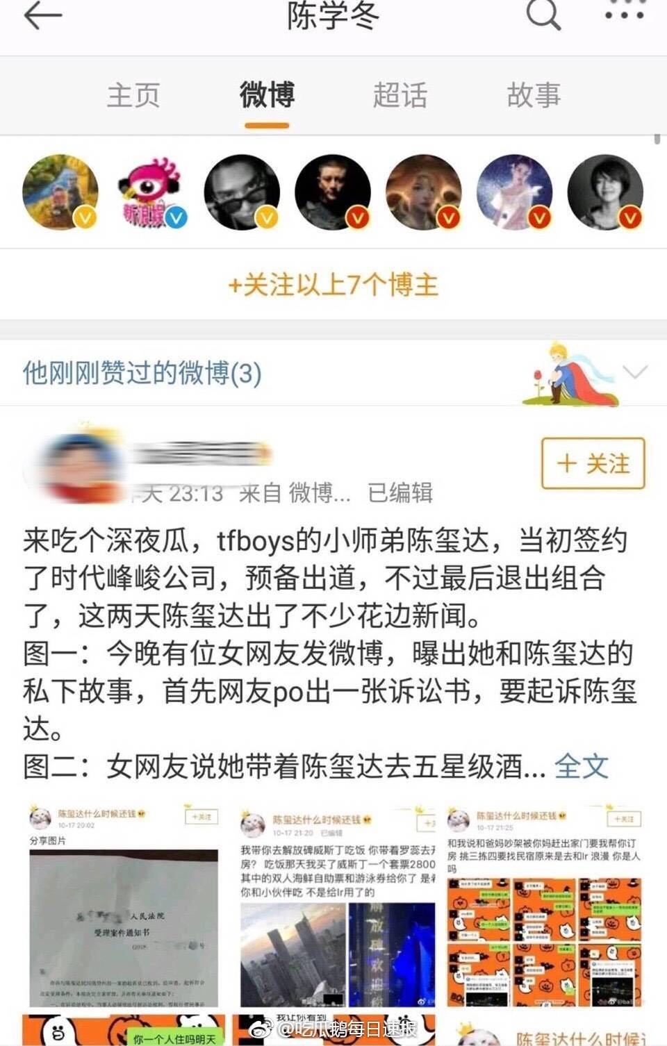 Yes娱乐10月18日综合报导昨晚,陈学冬微博帐号手滑点赞了营销号八卦粉丝控诉某未成年艺人不良行为的微博,四十几分钟后取消点赞。虽说事情发生在深夜,但众多“熬鹰”网友还是发现了端倪,原来这位名叫陈玺达的练习生和陈学冬名字缩写都是cxd,早前就有很多粉丝在微博上带cxd缩写要求其还钱,冬冬应该是半夜搜自己时一不小心吃了个瓜,一不小心又手滑点了下赞。今早,陈学冬微博幽默回应手滑点赞,晒出一张电商截图,配文称“有没有能帮到我的?”场面一度十分搞笑。网友纷纷回应“他只是吃个瓜,大家放过他吧哈哈哈哈哈”“搜自己名字缩写也太可爱了吧”“陈学冬一定在内心os:我寻思怎麽都让cxd还钱?”。