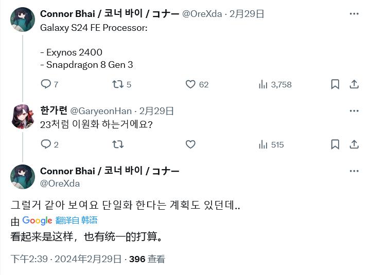 消息源表示三星 Galaxy S24 FE 同样会有 Exynos 2400 和高通骁龙 8 Gen 3 两种处理器,不过大部分都采用 Exynos 2400,只有极少数市场会采用骁龙芯片,而且三星还有统一使用 Exynos 芯片的打算。