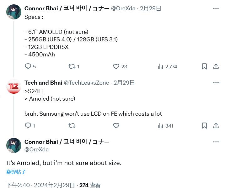 消息源表示三星 Galaxy S24 FE 会采用 6.1 英寸 AMOLED 屏幕,不过该手机尺寸目前并未确定。这款智能手机预计还将配备 12GB LPDDR5X RAM,以及 128GB(UFS 3.1)和 256GB(UFS 4.0)两种存储容量。IT 之家附上截图如下: