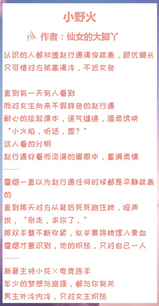 短评:这是一本超甜的情有独钟现言小甜饼,女主性格如文名,脾气野性子倔,可盐可甜小仙女。和男主认识源于一次错认人的乌龙事件。男主清冷性子,对内对外都是冷漠疏离,遇到女主也没改,然而表面淡漠之下是掩饰不住的真香定律,仿佛不在意其实都是各种关注在意。全文走的是“淡漠式甜宠”风格,就男主表面冷冷淡淡,下一秒可能穿围裙给女主洗手作羹汤,下一秒也可能披个马甲就带女主上分,还要隐瞒身份两局过后走人。看到后面也是可以看出来了,真是花式宠,清冷之下,男主是什么都做得出来,而且你还根本不知道他会怎么个宠法!总体来说,本文含糖量高,剧情和文笔都不错,男女主性格讨喜,人设越分析越有意思,实在不应该错过!