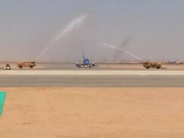 【中埃网】讯,据埃及门户网站MASRAWY7月9日报道,埃及新行政首都机场今天开始试运营,迎来埃航首个航班降落。埃及民航部长和旅游部长亲自到机场迎接,工作人员为顺利降落的航班举行了洗尘仪式。
