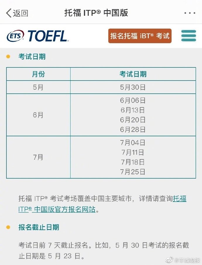 【6月份6项海外考试取消,考生该何去何从?】今日,教育部考试中心发布通知:根据当前新型冠状病毒防控的相关要求,继续取消6月托福、雅思、GRE、GMAT等考试。连续数月的考试取消无疑是对广大准留学生院校申请进程的巨大挑战。与此同时,@ TOEFL托福考试官方社区 宣布正式推出“托福ITP中国版”,帮助中国考生在这个特殊时期展现自身学术英语水平并完成院校申请。目前,英国伦敦大学学院(UCL)、美国哥伦比亚大学、卡内基梅隆大学、杜克大学法学院,德国科隆大学,荷兰鹿特丹管理学院等全球多所院校认可。考场已覆盖包括广州、深圳、北京、上海、天津在内的多个国内主要城市,考试日期也已开放至7月25日。托福ITP开考