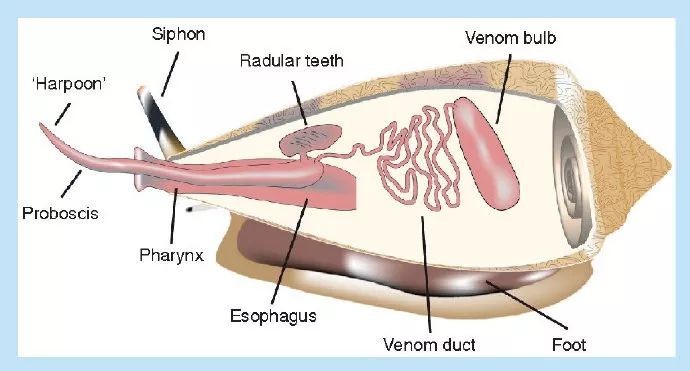 当芋螺的捕食对象(不同种类的芋螺偏好不同类型的猎物,可能是鱼类、沙蚕以及其他软体动物)被这根毒刺扎中之后,在短短几秒钟内就会停止挣扎,然后芋螺会张开“血盆大口”把它们囫囵吞下,再找个僻静地方慢慢消化掉。