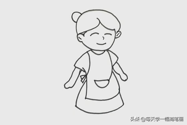 步骤二:往下画出衣领,画出妈妈的围裙,画围裙的时候注意褶皱、口袋还有后面的系绳,接着画出里面的长裙,在袖口处画出妈妈的手臂。