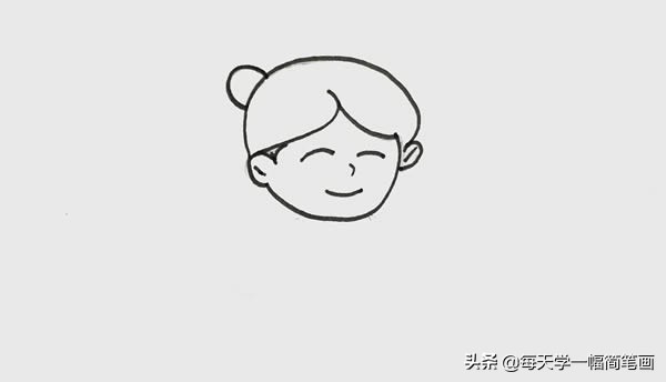 步骤一:先画出一个中分的发型,在左上角画出丸子头,接着画出脸和耳朵的轮廓,在上面画出笑眯眯的眼睛、鼻子和嘴巴。