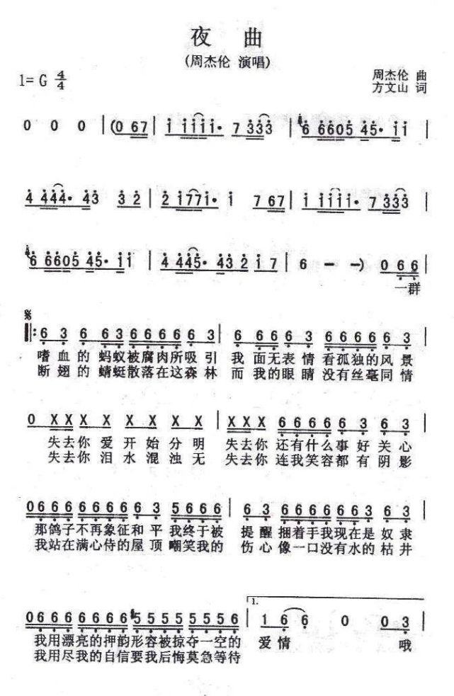 《夜曲》作曲方面多采用56(嗦啦)重复叠音,占据整首歌曲的主音调,是小调情歌与周式饶舌的完美结合,悲怆吉他+古典钢琴凄美纪念逝去恋人,“为你弹奏萧邦的夜曲,纪念我死去的爱情,跟夜风一样的声音,心碎的很好听…”