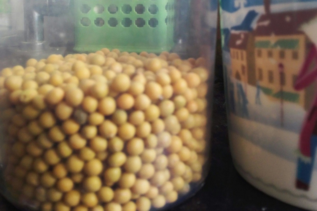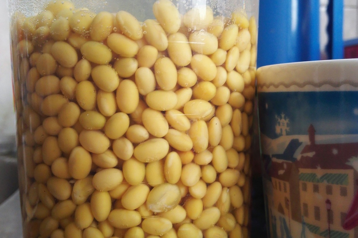 3、豆子泡好比原来大两倍,第一次发豆芽有点就行,别看生豆子不起眼,其实泡完之后,黄豆的出菜率很高,如图所示。