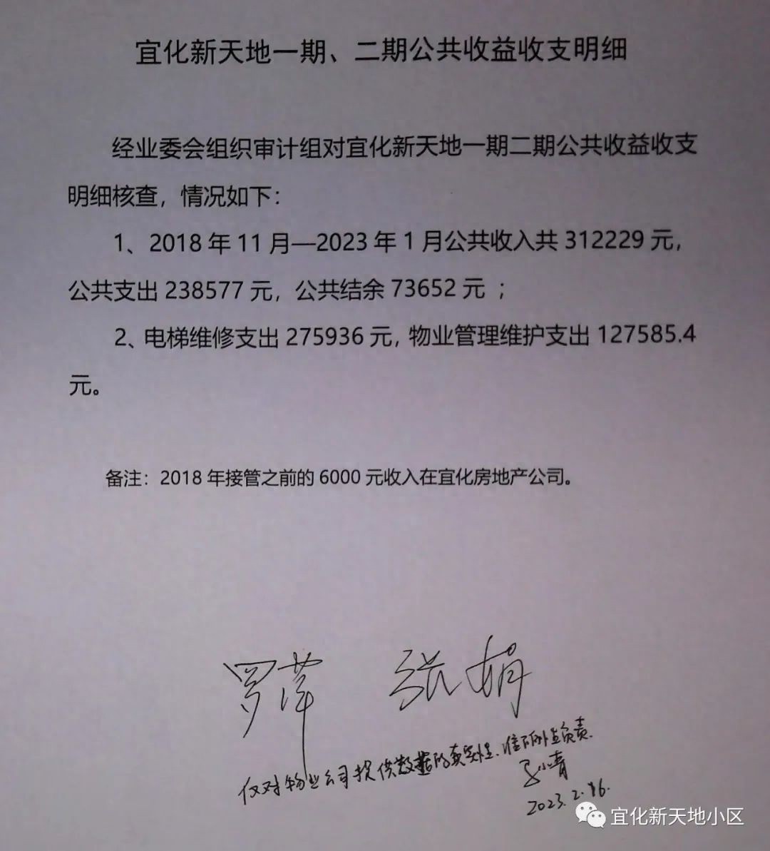 以上审计结果,接受广大业主监督及质疑,纸质版2月18日张贴至各栋楼宣传栏处。如有疑问和查账需求,请联系业委会杨正鑫(186……)。