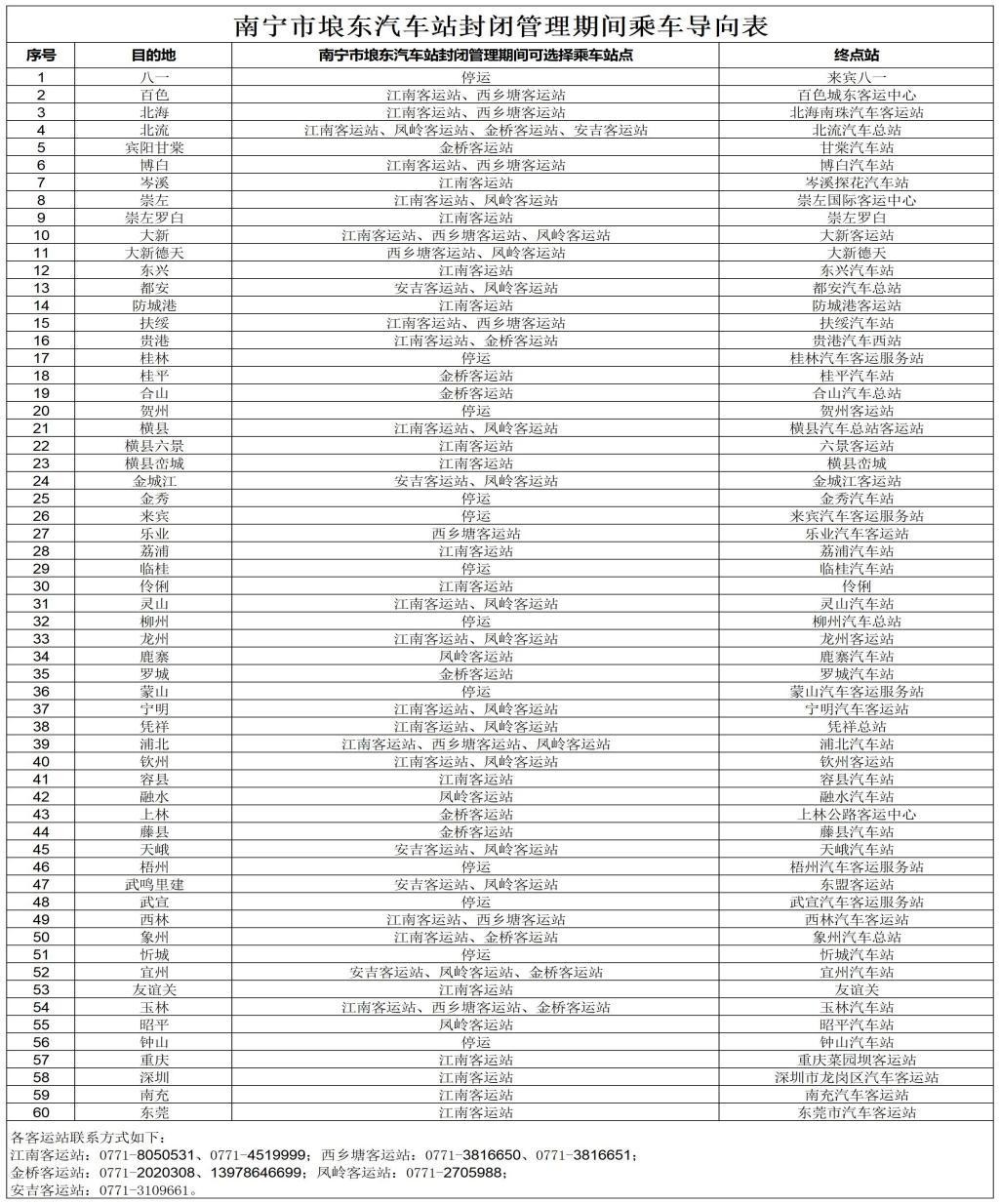 根据新冠肺炎疫情防控工作的需要,南宁市埌东汽车客运站从12月6日上午6:00起实行封闭管理。为保障南宁市埌东汽车客运站封闭管理期间旅客正常出行需求,南宁市交通运输局发布公告,将南宁市埌东汽车客运站封闭管理期间乘车导向表公告如下,有乘车需求的旅客可选择到以下客运站购票乘车。