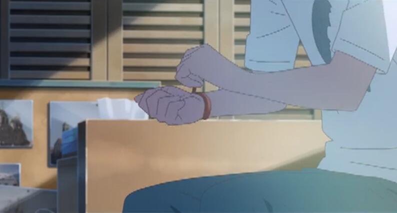 大家有没有发现,泷在没有交换身体的时候手腕上是有红绳的,但到了三叶在泷体内的时候,手腕上就没有红绳。可以分析出,泷在每天睡觉的时候都会把红绳接下,因为时间的悖论,三叶还不知道自己三年前到东京找过还不认识自己的泷,所以就不知道红绳这事。这就是为什么三叶在泷体内的时候,手腕上没有红绳的原因。