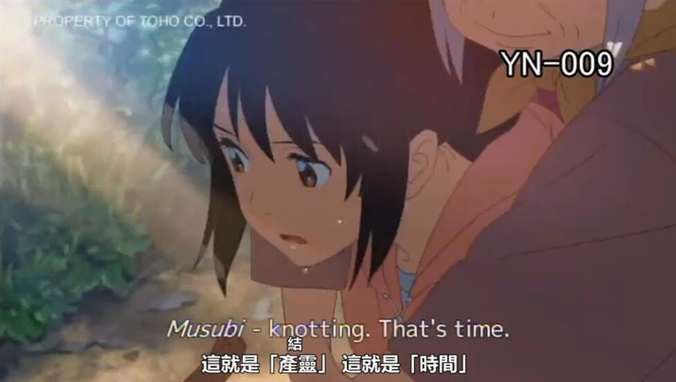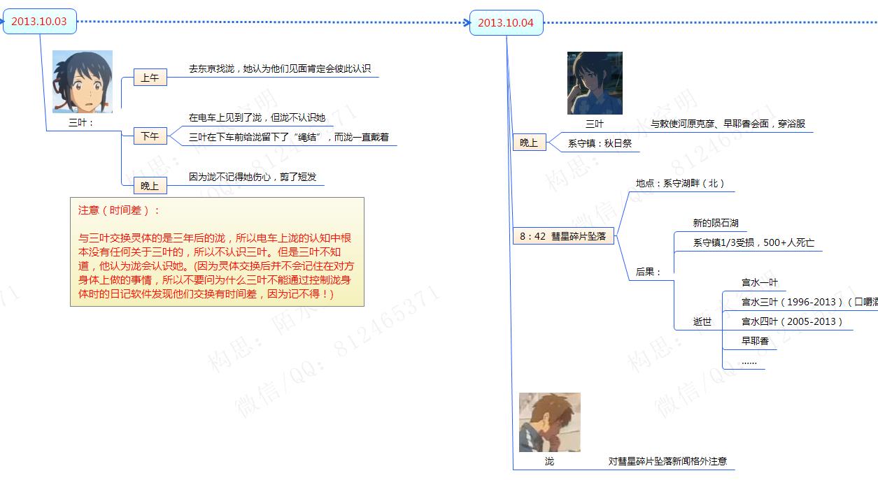 我们再来说说泷喝了三叶的口嚼酒并看到洞窟的壁画后,为什么能看到三叶一生的细节。你们还记得吗?泷陪奶奶去宫水神社的本体供奉口嚼酒的时候说过,红绳是连接时间和人,口嚼酒则是三叶的一半。泷看见彗星分裂并摧毁系守,然后三叶从细胞逐渐发育成婴儿,在医生剪断三叶与二叶(三叶的母亲)的脐带时,被名为家庭的的结说束缚,然后三叶去东京找泷,并把一直系在头上的红绳递给了还不认识自己泷,非常伤心的三叶回到家后剪掉了长发,剪断了名为恋爱的结。 泷喝了三叶的口嚼酒,再加上红绳,再一次把恋爱的结连接了起来,这就是为什么泷能看到三叶的过去并穿越时空。