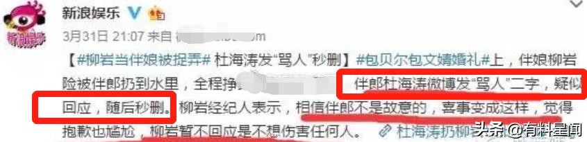 当天晚上,一段“闹伴娘”的视频在网上引起关注,视频中,杜海涛、韩庚、包贝尔等人抬着伴娘柳岩,准备将她扔进水池中。