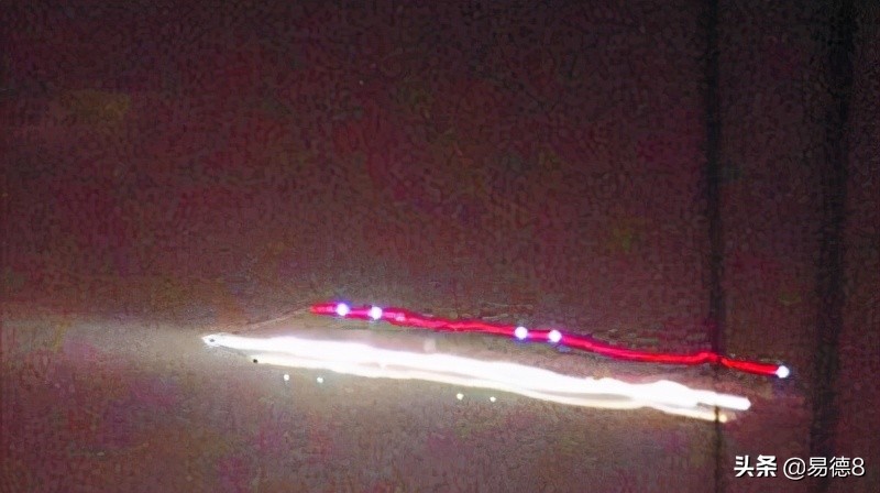 从这张放大的照片看,这个UFO上的灯带的并不规则,而流动的,但其实并不是灯带,而是拍摄过程中的镜头位移+飞机的飞行移动+手持手抖造成了这种结果!很多延时照片中流光溢彩也是类似的手法。