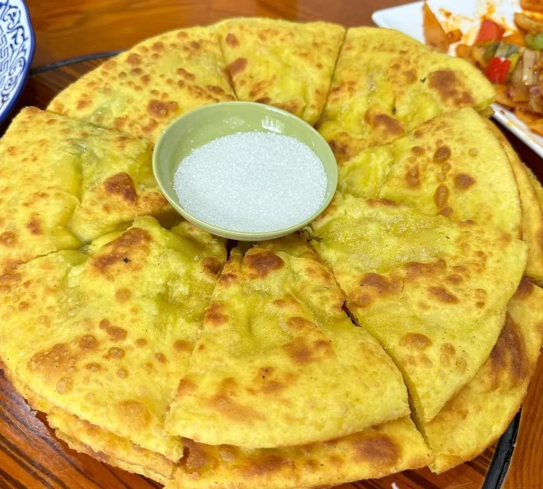 狗浇尿”是青海省极具地方特色的一种传统面食,其制作时需沿锅边不断浇油,动作形似狗撒尿,因而得名。主料为青稞面加香豆粉煎制,薄脆香酥,高原香料独特。