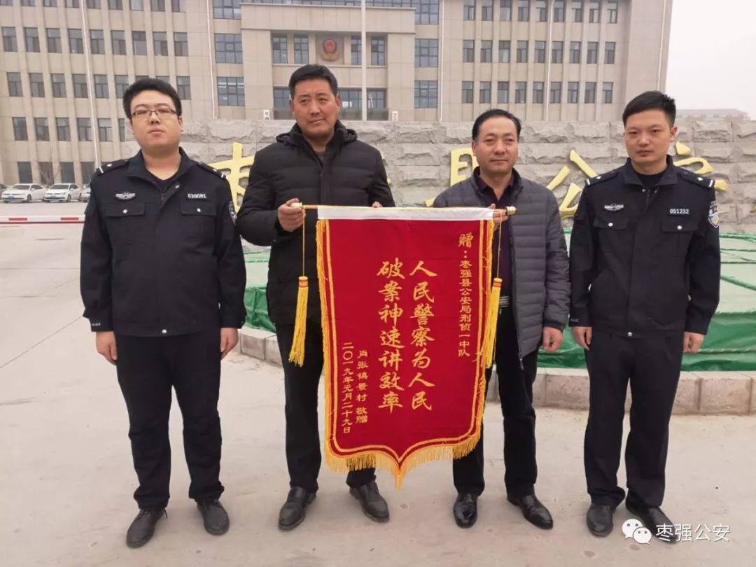 1月30日上午,阵阵锣鼓声在枣强县公安局门前响起,村干部送来“人民警察为人民、破案神速讲效率”的锦旗,这是村里朴实的群众,对尽职尽责的枣强公安民警热情洋溢地礼赞!