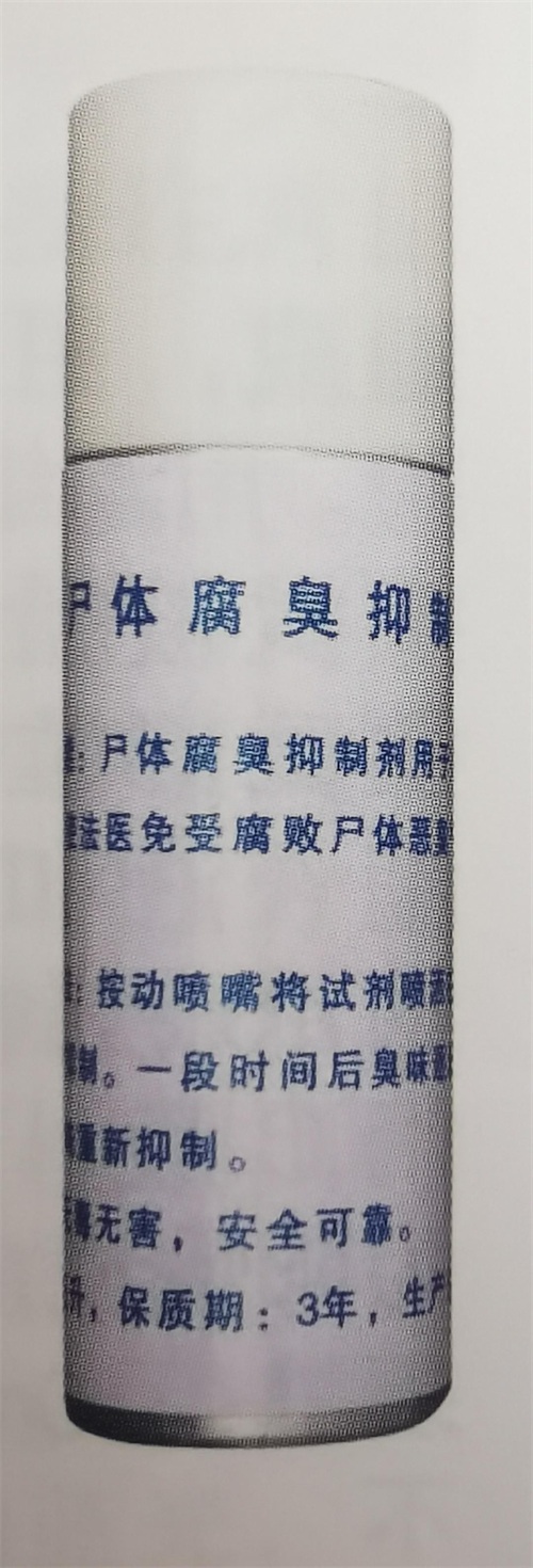 在我参加工作的头两年,我还用过这个叫做“尸体腐臭抑制剂”的东西。在它的产品介绍上这样写道:“该产品用于抑制腐败尸体发出的臭味,使法医工作者免受腐败尸体恶臭难挡的痛苦,改善工作条件。用法:手按喷嘴按钮,将试剂喷洒在尸体表面上,臭味立即被抑制。经过一段时间臭味逐渐回升,再次喷洒,可将臭味重新抑制。”