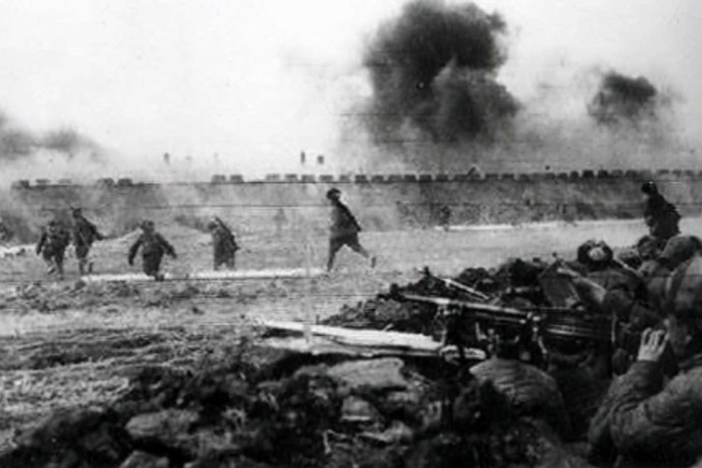 东北野战军战士们冒着敌人的炮火前进,攻入锦州城。