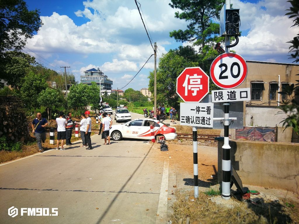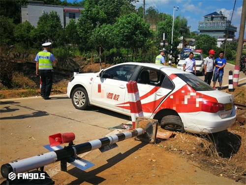 “我们的车辆在离这个道口大概是200米的位置,警报就自动启动了。这个报警灯一直在闪烁,喇叭一直在报警:火车来了注意安全,一直要等火车通过道口之后才自动停下来的。但是我们的机车到了这个道口的时候,教练车正好过来,一下就碰到车头上面。” 湘潭电化集团安保部工作人员彭晓光告诉905记者。