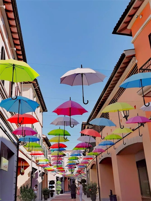街道上还悬挂着色彩鲜艳的雨伞,
