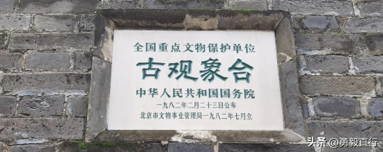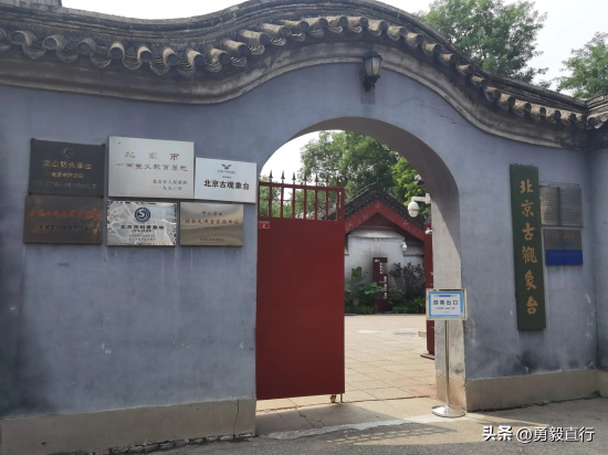 古观象台展区共分为三部分:第一部分是左手边的城楼,为古观象台展区;第二部分是右手边月亮门进去的四合院,属于展品陈列介绍;第三部分是后院,在古观象台下面的区域,从登古观象台的登城口的通道,可以进到后院。城楼上的老牌匾上写的是观象台,右侧的红门是1979年大雨古观象台东半部塌方重修时,把这小段城墙掏空,并开辟为展厅,但现在也关闭了。