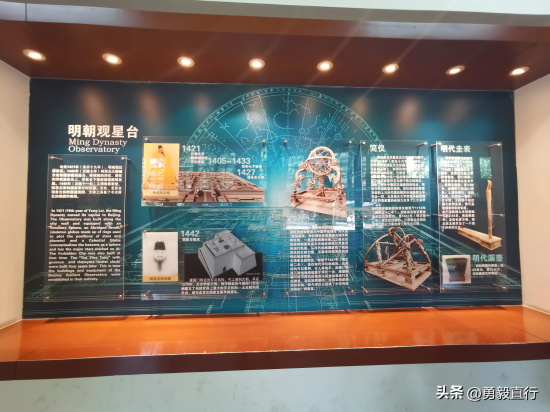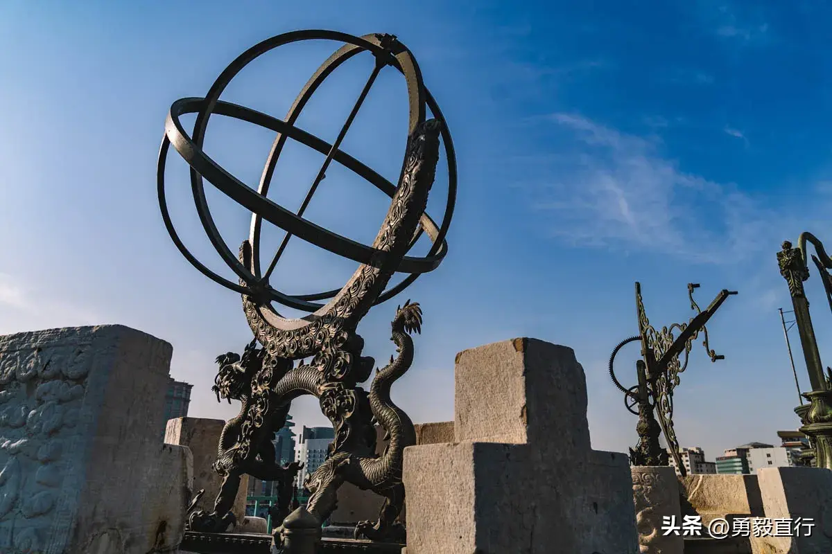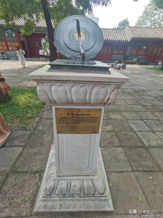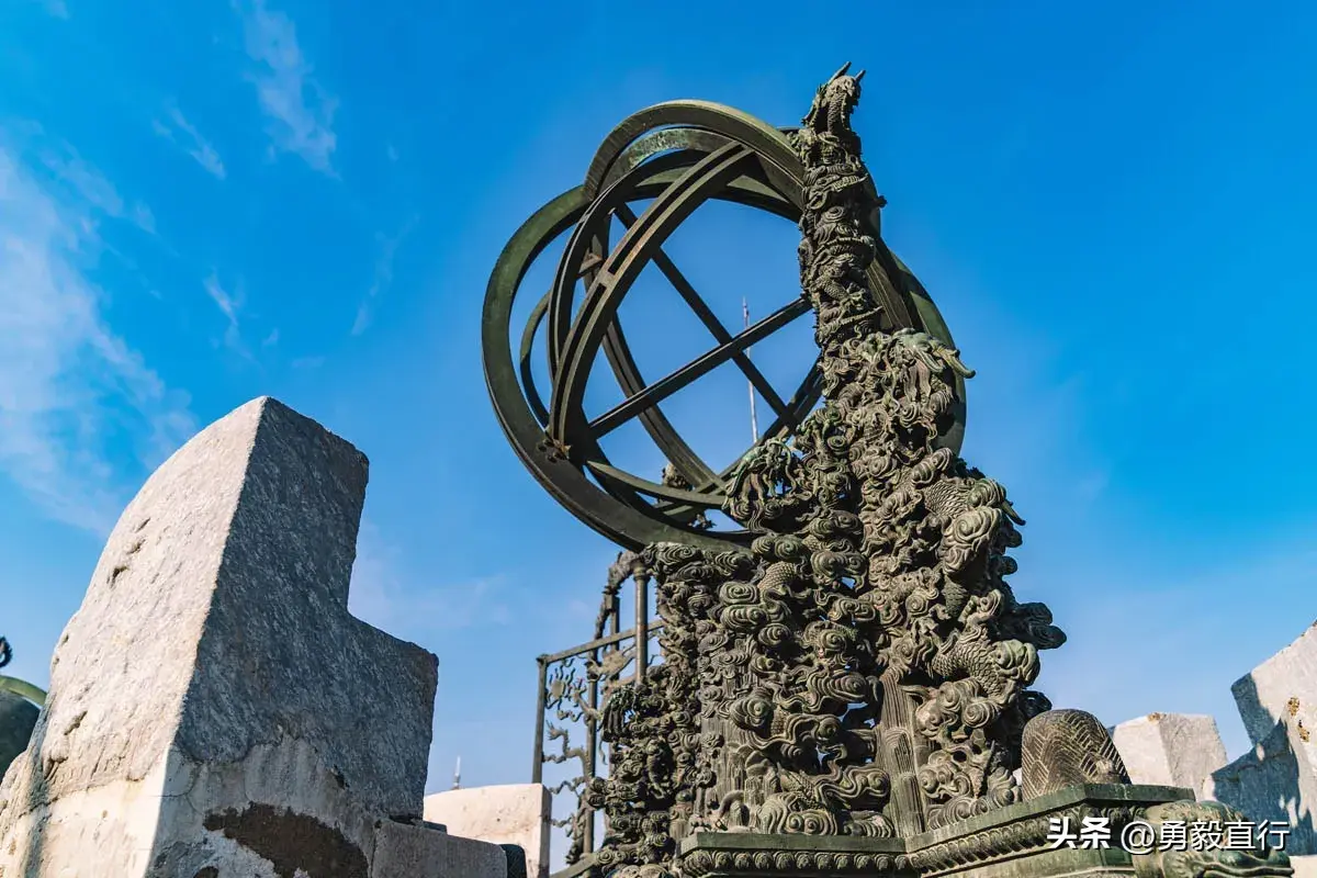后院的区域并不大,有明代浑仪和简仪的复制品,真品在九一八事变后,1933年迁至南京紫金山天文台。还有玲珑仪的复制品,角落未开放的临战景堂旁边,还有日晷和圭表等古代计时仪器展示,都是石制的。有地平式日晷,相当于现在的钟表,不过针影在石盘上指出的时间不是现在咱们用的北京时间,而需要在现在的时间上加上15分钟。
