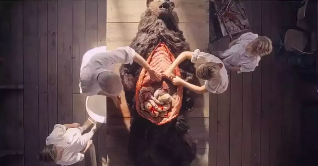 一伙人在解剖一只死去的棕熊。