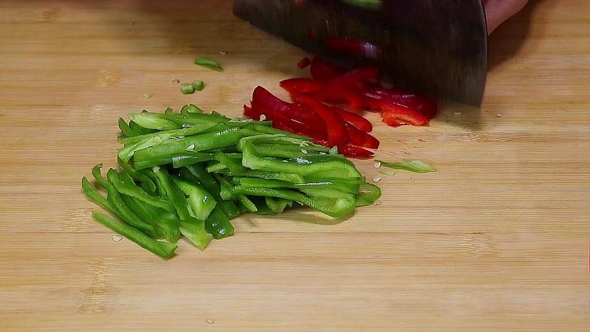 4、等到它们全部抓匀之后,咱们最后放上一点食用油,将它们继续抓匀,抓匀之后先放到一旁腌制十分钟。接下来把青红椒切一下,青红椒清洗干净,然后去掉辣椒籽,去完之后咱们将它们都切成丝,把切完的辣椒丝放到一个盘中备用。