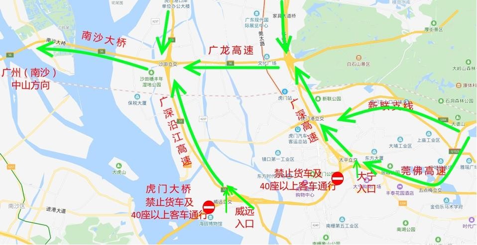 五、莞佛高速公路虎门威远入口—绕行广深沿江高速公路—广龙高速公路—南沙大桥—往广州(南沙)、中山方向。