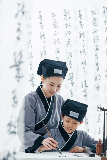 妈妈在辅导孩子毛笔字