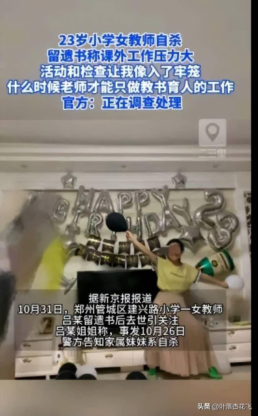 据新京报报道,10月31日,郑州管城区建兴路小学一女教师吕某留遗书后去世引关注。吕某姐姐称,事发10月26日,警方告知家属妹妹系自杀。