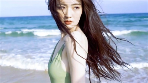 趴在海滩上的徐璐,绿色丝裤秀出水蛇腰和蜜桃臀,手托着下巴,增添几分理性的思考。