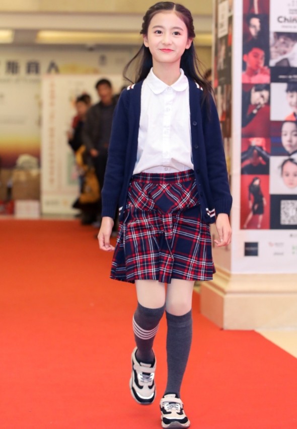 她身穿的这套穿搭很简单干净,上身穿了一件深蓝色的开衫外套,整洁干净的外套很清新,内搭白色的衬衫更是凸显了简约大方的气质,搭配一条格纹的半身裙,这样的搭配,9岁太成熟。