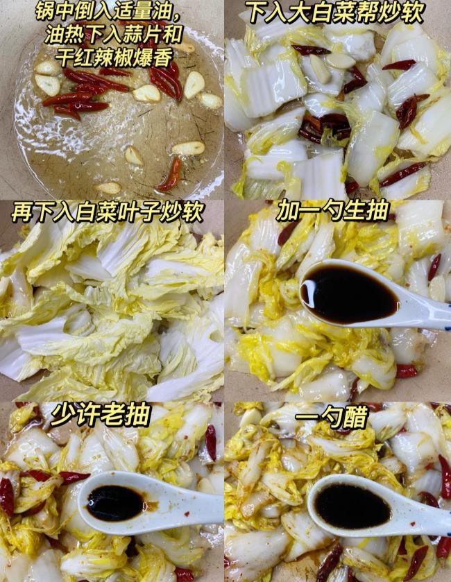 材料:白菜、蒜末、干辣椒、生抽、醋、盐、糖、淀粉、食用油