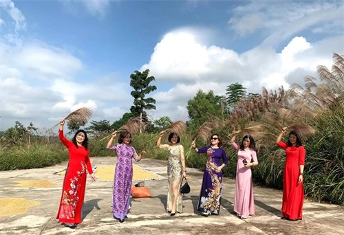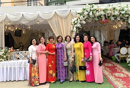 越南的婚礼一般穿两套衣服,一套婚纱,一套奥黛,婚礼上的奥黛颜色款式五花八门,而且分分钟有种可以拍时装大片的感觉,百花争艳,下面几张是我大嫂贵妇女团提供的照片