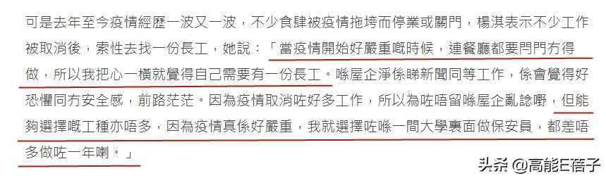 面对港媒的采访,杨淇大方承认担任保安员一职。并表示疫情发生后,她其实做过餐厅服务员、学完插花后去花铺卖花、还做过韩国餐厅的厨师。