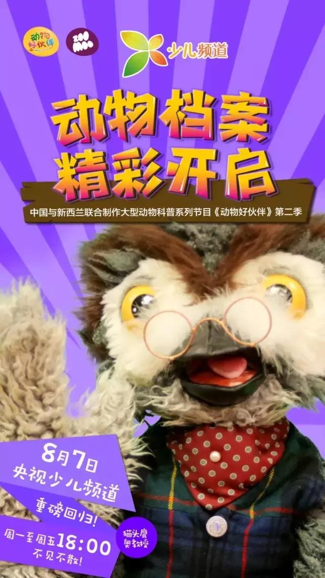 8月7日起每周一至周五18:00,广受好评的互动性动物科普节目《动物好伙伴》第二季在央视少儿频道强势回归,重装上阵啦!可爱玩偶、萌趣动画、益智故事、互动小游戏、好听又好学的动物歌曲,让萌宝们边玩边学,玩转暑期!