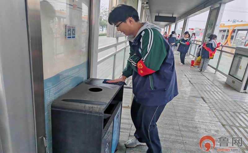 在打扫完校园周边环境后,同学们又来到了车站站牌和 BRT 站台。在这里,他们不仅继续进行清洁工作,还积极开展文明宣传活动。有的同学认真擦拭站牌和站台的玻璃、座椅,让这些公共设施一尘不染。