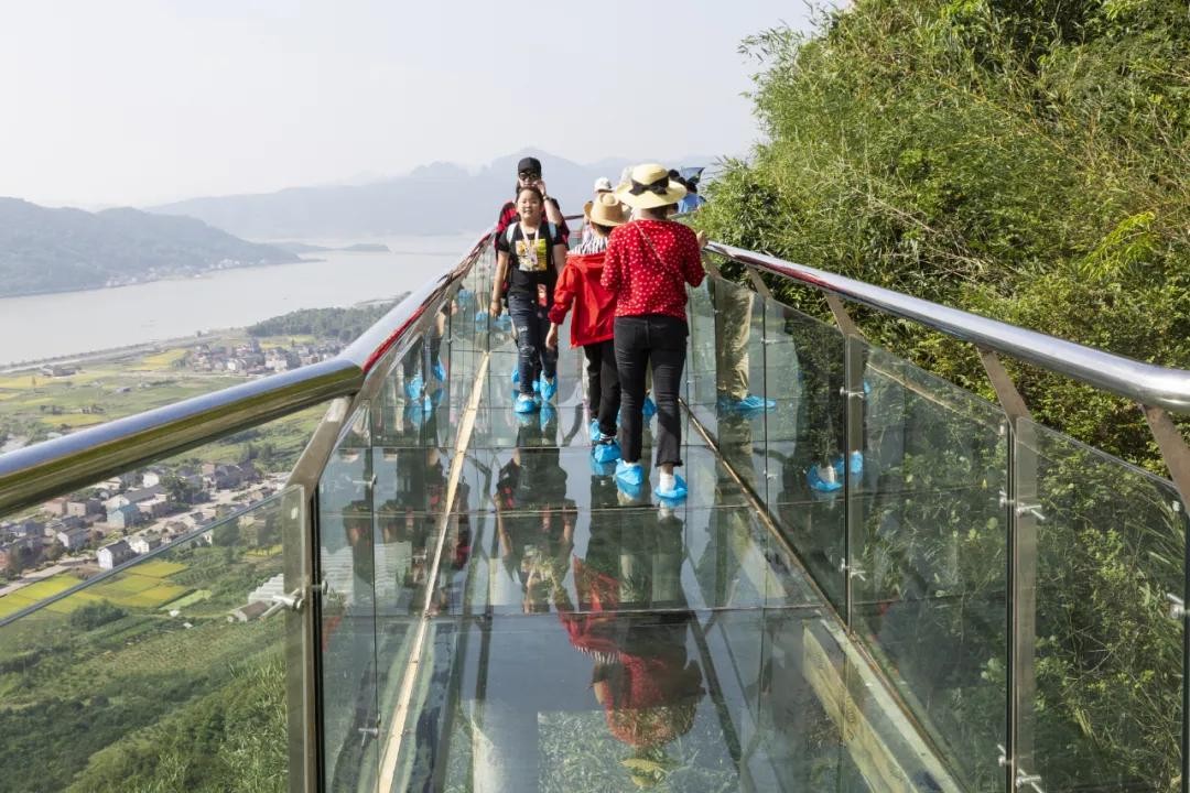 沿着白岩山登山游步道上来,百株梅花像是一条红色长龙直达观海平台,站在海景平台上,远可眺大目湾海上日出,近可观蟹钳港日落,玻璃栈道更能让游客一览蟹钳港全貌,同时感受玻璃栈道的刺激。