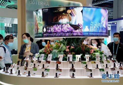 11月8日,参观者在第三届进博会多特瑞展台了解精油展品。新华社记者 刘颖 摄