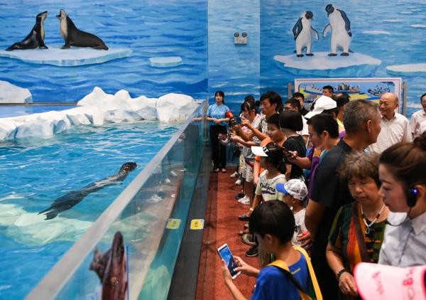 8月18日,在长沙极地馆,游客在观看海豹表演。