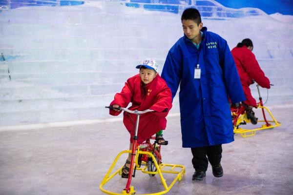 8月18日,在长沙极地馆冰雕艺术展示区,小游客在工作人员的帮助下体验冰上自行车。