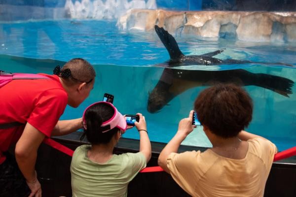 8月18日,在长沙极地馆,游客在拍摄海狮。