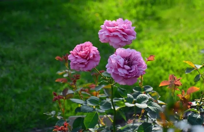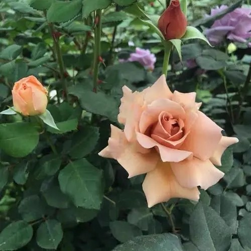 首先,我想讲到的那便是天方夜谭月季,这是一款兼具色泽深邃、香气萦绕及耐夏季高温的月季品种。深紫色的瓣边映衬着柠檬茶般的清甜香氛,翠绿的叶片更透露出勃勃的生机与活力,显得格外迷人,深受广大赏花爱好者的好评。加上长达两至三个月的花朵绽放期,使得这款月季风靡全球。