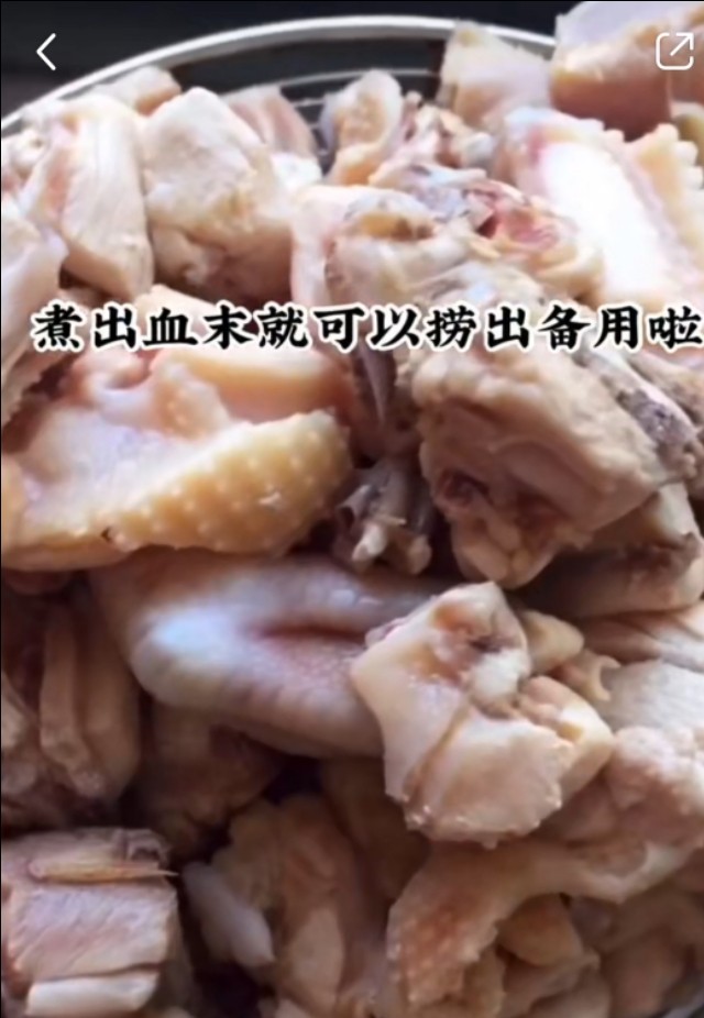 剁好的鸡肉下锅淖水,捞出浮沫,加点料酒去腥