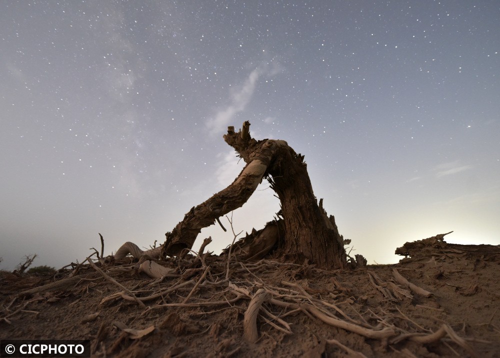 夏至时节,新疆维吾尔自治区塔里木盆地出现晴好天气,千年沧桑胡杨与星空、日出相互映衬,呈现出沧桑壮美景象。胡杨是第三纪残余的古老树种,由于它具有惊人的抗干旱御风沙耐盐碱的能力,能顽强生存繁衍于沙漠之中,也被誉为“沙漠英雄树”,更有着“生而不死一千年,死而不倒一千年,倒而不朽一千年”的美誉。