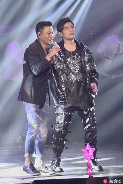 两个时代的天王世纪大同框,合体献唱《忘情水》、《浪子心声》等经典歌曲,周董还现场为华仔表演乐魔术。