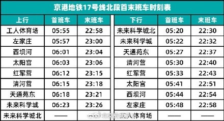 最新!北京地铁17号线北段首末班时刻表公布