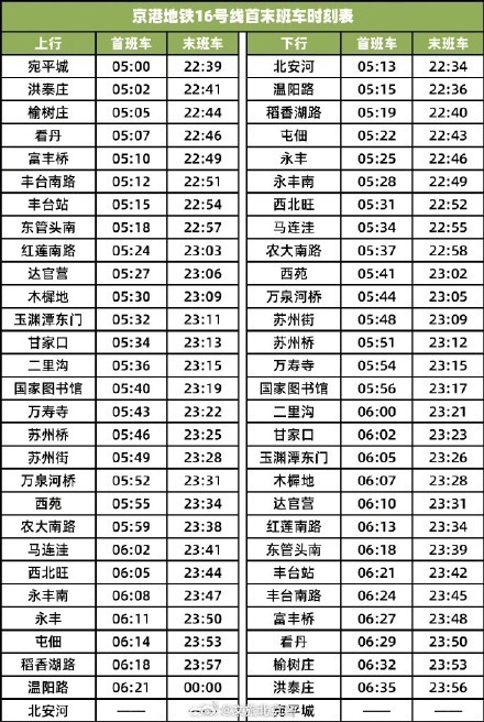 为进一步提升乘客出行体验,16号线实现贯通后,各站首末班车时间也有所调整,将延长运营服务时间。16号线下行(北安河-宛平城)北安河站首班车发车时间为5点13分,较贯通前提前2分钟,末班车发车时间为22点34分,较贯通前延后2分钟;16号线上行(宛平城-北安河)宛平城站首班车发车时间为5点,末班车发车时间为22点39分。